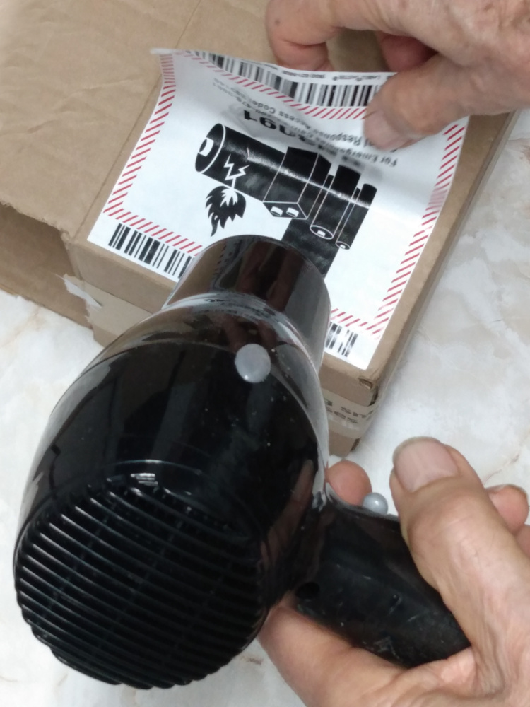 I use my hair dryer on LOW HEAT to remove sticky labels and self-stick sanding discs off of my drill disc sander. *CAUTION: (DO NOT USE HEAT ON PLASTIC or GLASS CONTAINERS. Be careful and keep hands away from the hot air. Also, (DO NOT [UNDER ANY CIRCUMSTANCES] USE A HEAT GUN TO REMOVE A LABEL ON ANY CONTAINER). A heat gun can reach temperatures of over 1500℉ (815℃) degrees and cause severe burns. It is best to ware a cotton or leather glove when removing a label. It is wise to heat the label and move the hair dryer away and then slowly pull the label away. Always be aware of the label getting too hot to touch. This method works on cardboard boxes. However, do not use a HAIR DRYER to remove labels from PLASTIC OR GLASS containers, bottles or jars. The heat can cause the glass to shatter or the plastic to melt! For glass bottles and jars I put hot water at about 120℉ (49℃) degrees in the jar and let it stand for about 3-5 minutes then slowly peel the label away. Sometimes the label does not all come off. Then Goo Gone may help.