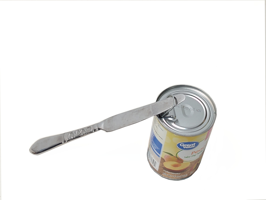 Step 4: Gently slide a table knife into the pull ring as show. Hold the can firmly and gently pry the lid open. If the lid is loose, just gently pull the ring all the way open. If not PLAN B is below.