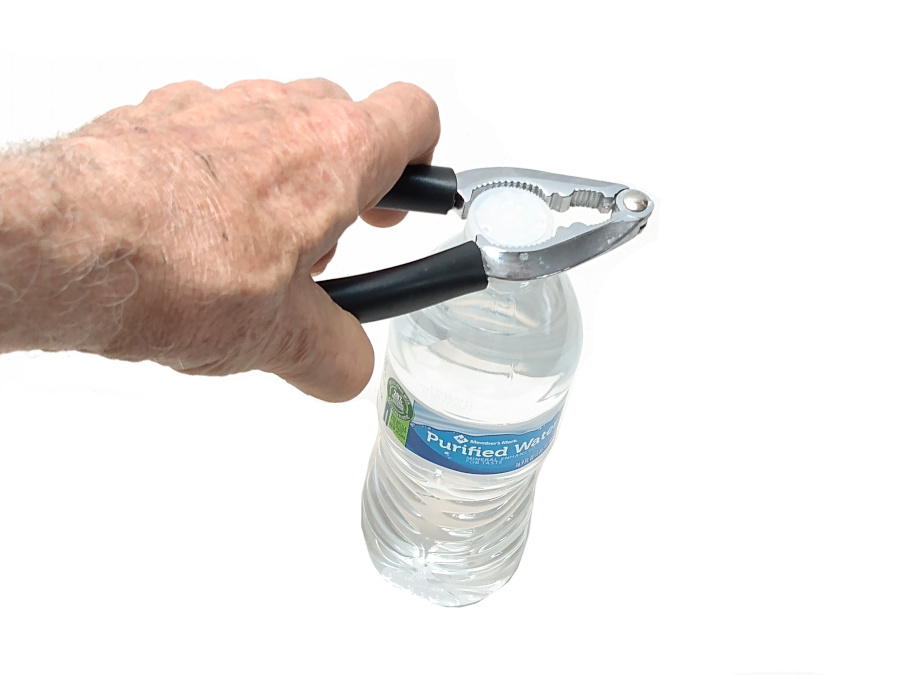 I use a nut cracker to open small bottles, especially water bottles. On thin bottles, it is important to get the nut cracker over the top rim of the lid because it will otherwise crush the lid and the bottle too. I do not use any more force than necessary on thin bottles.