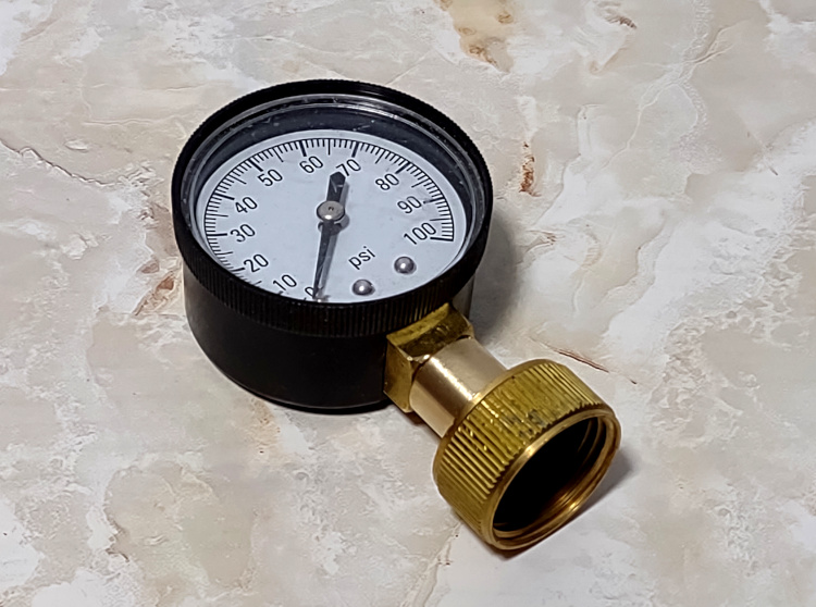 I HAVE TO CHECK MY WATER PRESSURE BECAUSE I HAVE A WATER PRESSURE REGULATOR SET AT 38psi (2.62bar). I got this gauge at Lowe's for about 12 us dollars. It has a garden hose thread. I put it on the cold water tap behind my washing machine. It works great.
