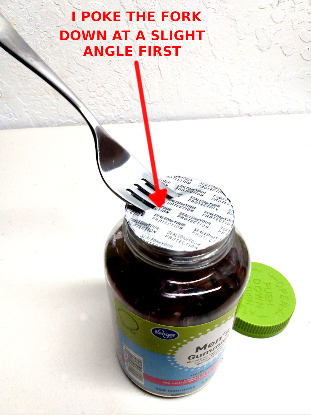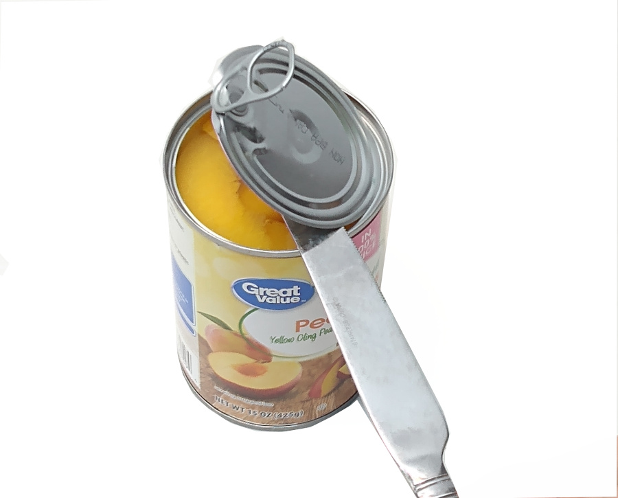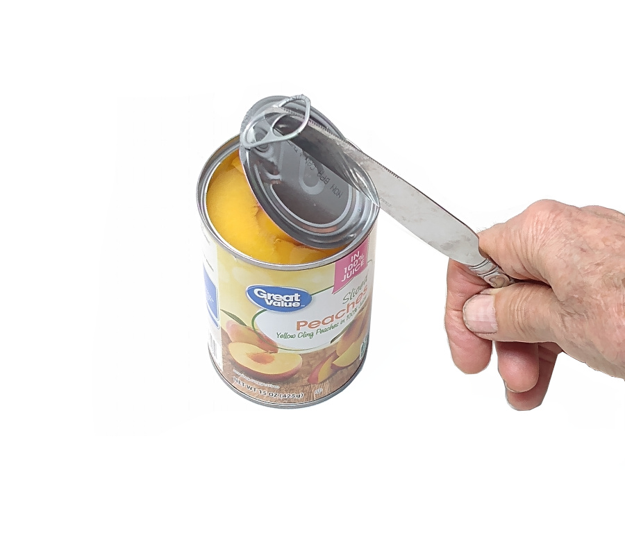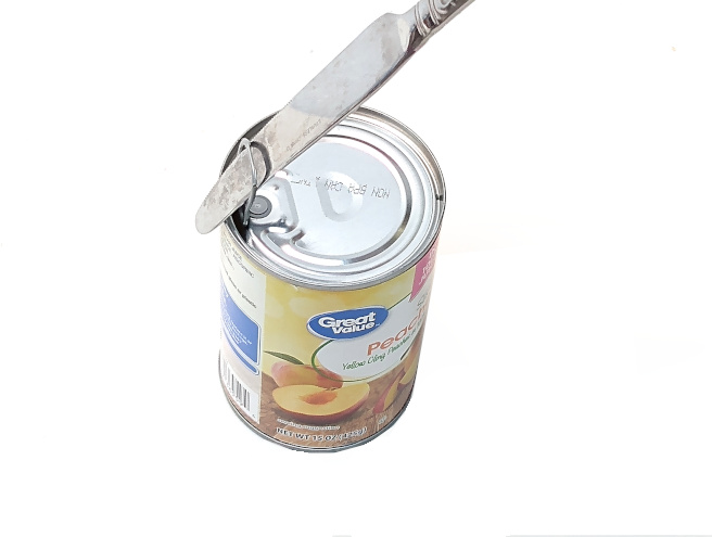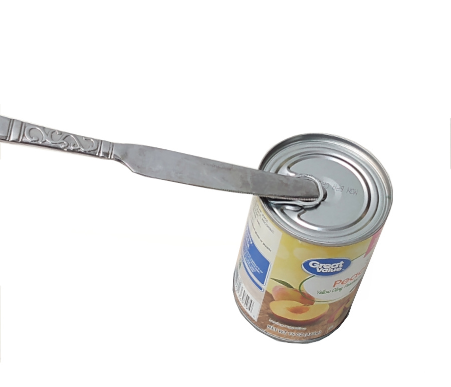 Step 4: Gently slide a table knife into the pull ring as show. Hold the can firmly and gently pry the lid open. If the lid is loose, just gently pull the ring all the way open. If not PLAN B is below.