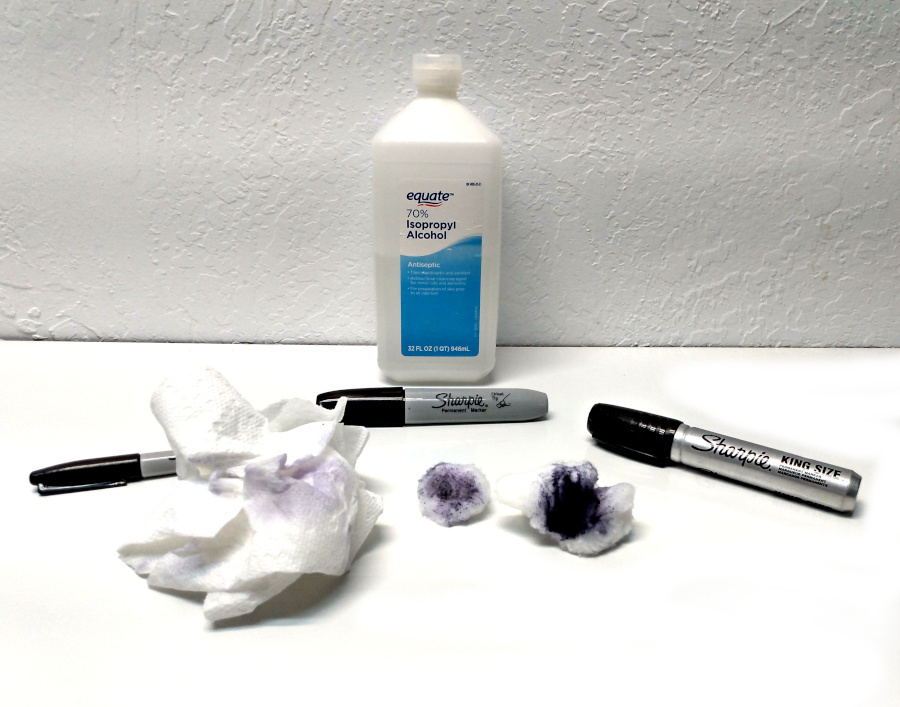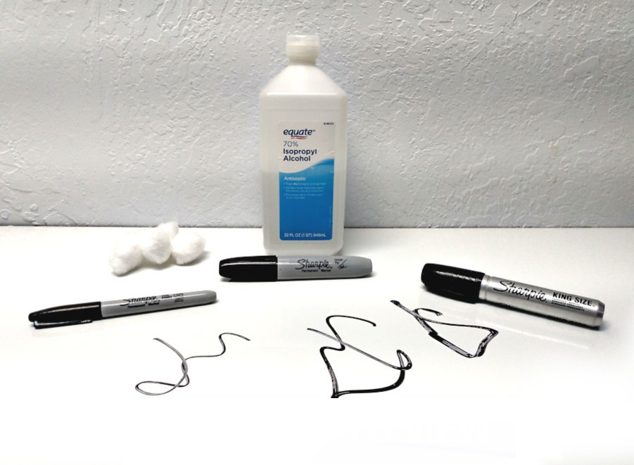I use 70% Isopropyl Alcohol IF THE SURFACE WILL NOT BE HARMED BY ALCOHOL! to erase Marks made by Marker pens. I use cotton Balls and a Paper Towel to erase the marks if the marks don't erase easily, I use Barkeepers Friend cleanser powder "IF" the surface will not be harmed by minor scratches.