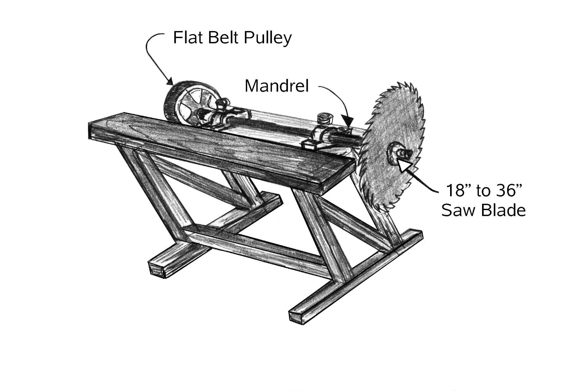 A drawing of a CORDWOOD or BUZZSAW from the old days. |