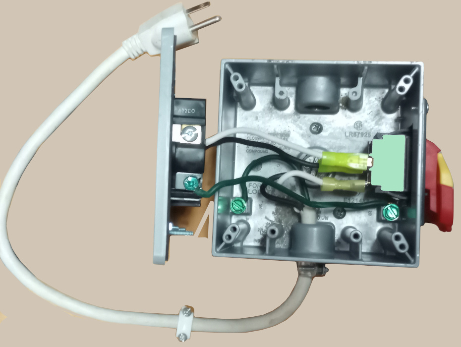 The switch wiring is simple. The box is a BELL, TWO-GANG, Outdoor aluminum box from Home Depot and a heavy duty plastic cover plate. The safety switch is a Powertech locking safety switch from Amazon.com NOTE: The plastic cover cannot be grounded, so it is important that the switch is double grounded. One ground wire goes from the switch to the box and the power cord "GROUND" is connected to the box. If one decides to make this switch box "be sure and seek electrical help as needed!"